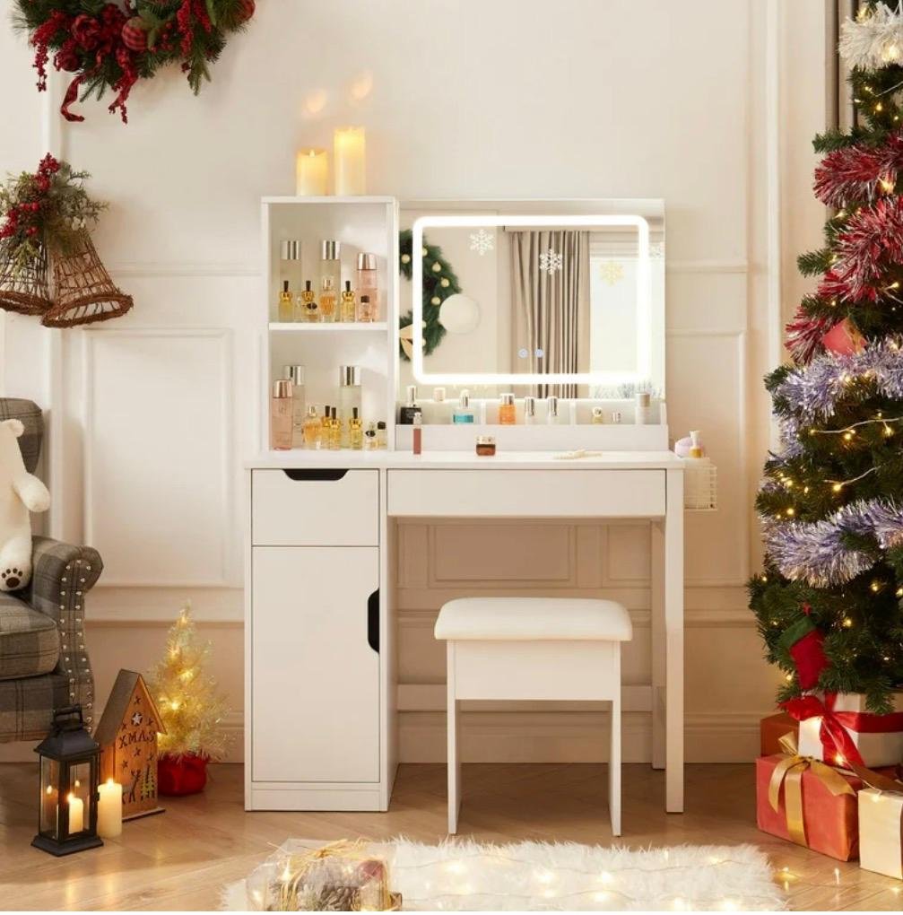 Upgrade your beauty routine with the Mainstays GRWM Deluxe 2-Piece Vanity and Stool, now available for $109 at Walmart. This stylish and functional vanity features a lighted mirror with USB power, perfect for makeup application, skincare routines, or organizing your beauty essentials. The matching stool provides comfortable seating, making it an ideal addition to bedrooms or dressing areas.\