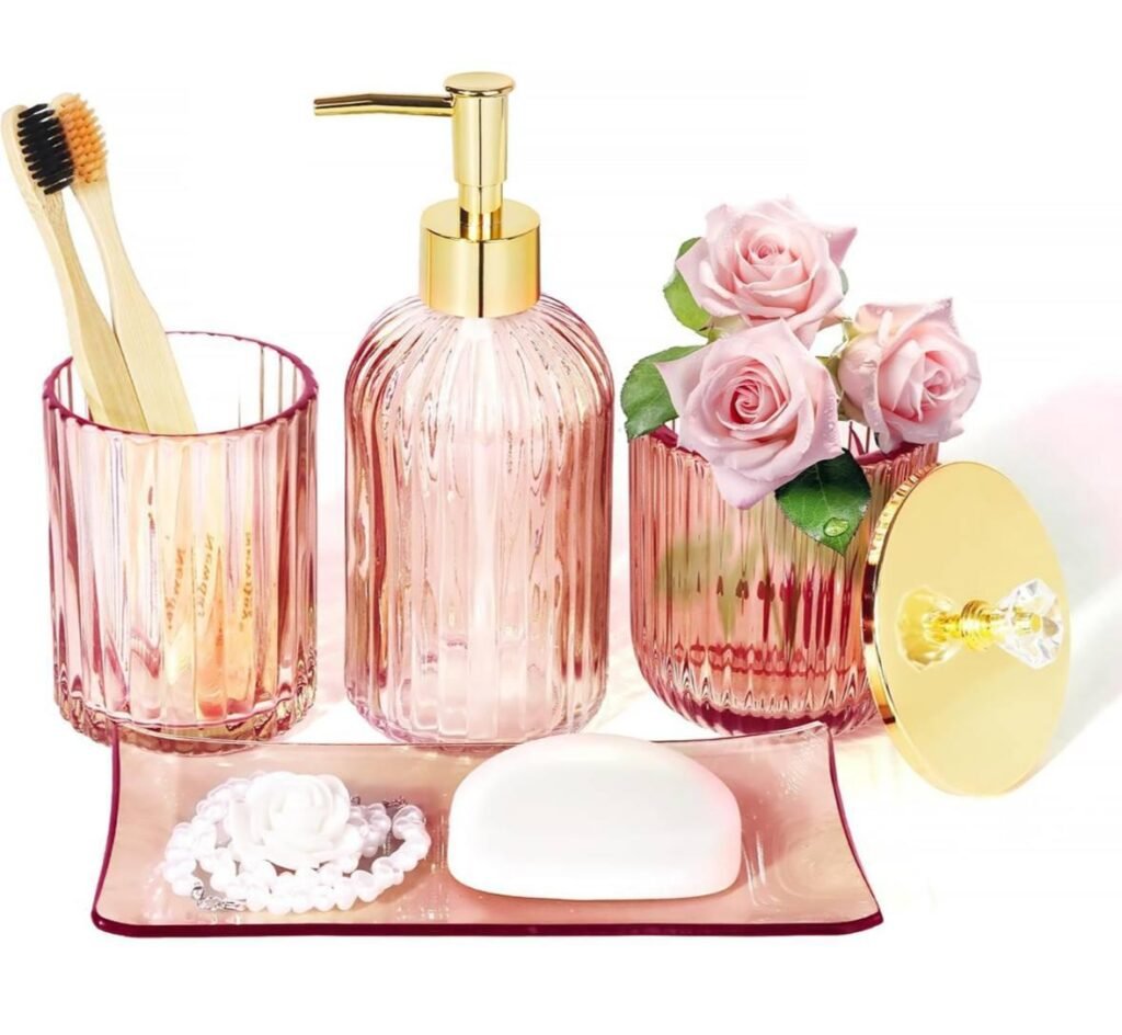 Upgrade your bathroom décor with this designer pink glass bathroom accessories set, now available for just $11.99 at Amazon. This stylish 4-piece set brings a vintage-inspired look to your vanity while keeping everyday essentials organized. With its elegant glass design and soft pink tone, it’s perfect for adding a chic, coordinated touch to bathrooms, guest spaces, or apartment makeovers at a budget-friendly price.