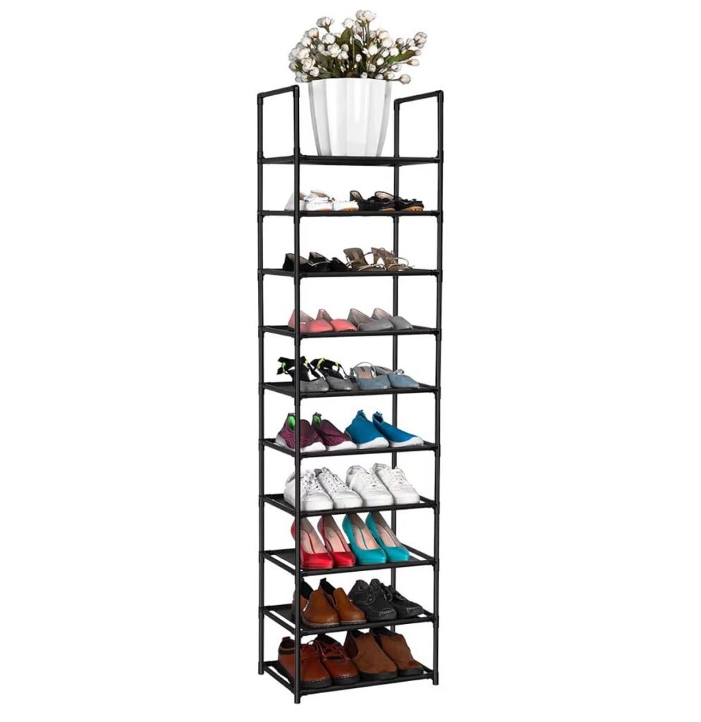 • 10-tier shoe rack holds approximately 20–25 pairs of shoes