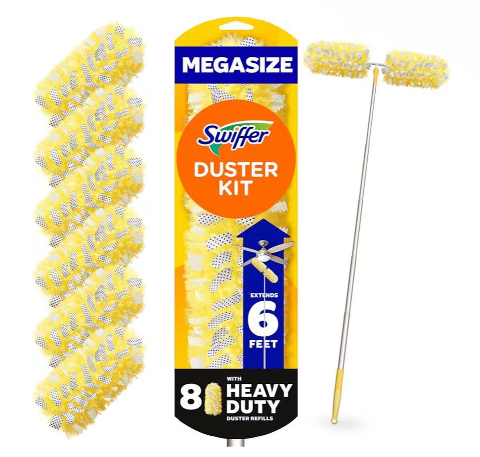 Keep your home dust-free with the Swiffer Duster Kit, featuring a heavy-duty starter kit with 8 refills. The 6 ft extendable handle helps you reach high or tricky spots with ease.