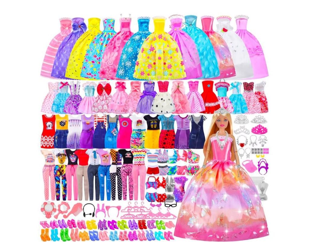 Delight your children with this 135-piece doll clothes and accessories set, complete with a doll to start their imaginative play right away. This set includes a wide variety of stylish outfits and accessories, allowing kids to mix and match looks for endless fun. From princess gowns to casual wear, swimsuits, and shoes, every piece is designed with attention to detail and vibrant colors. Hangers are included to help keep the outfits organized, making it easy for children to create and store different looks for their dolls. Perfect for creative play, storytelling, or gifting, this set encourages fashion creativity and role-playing.
