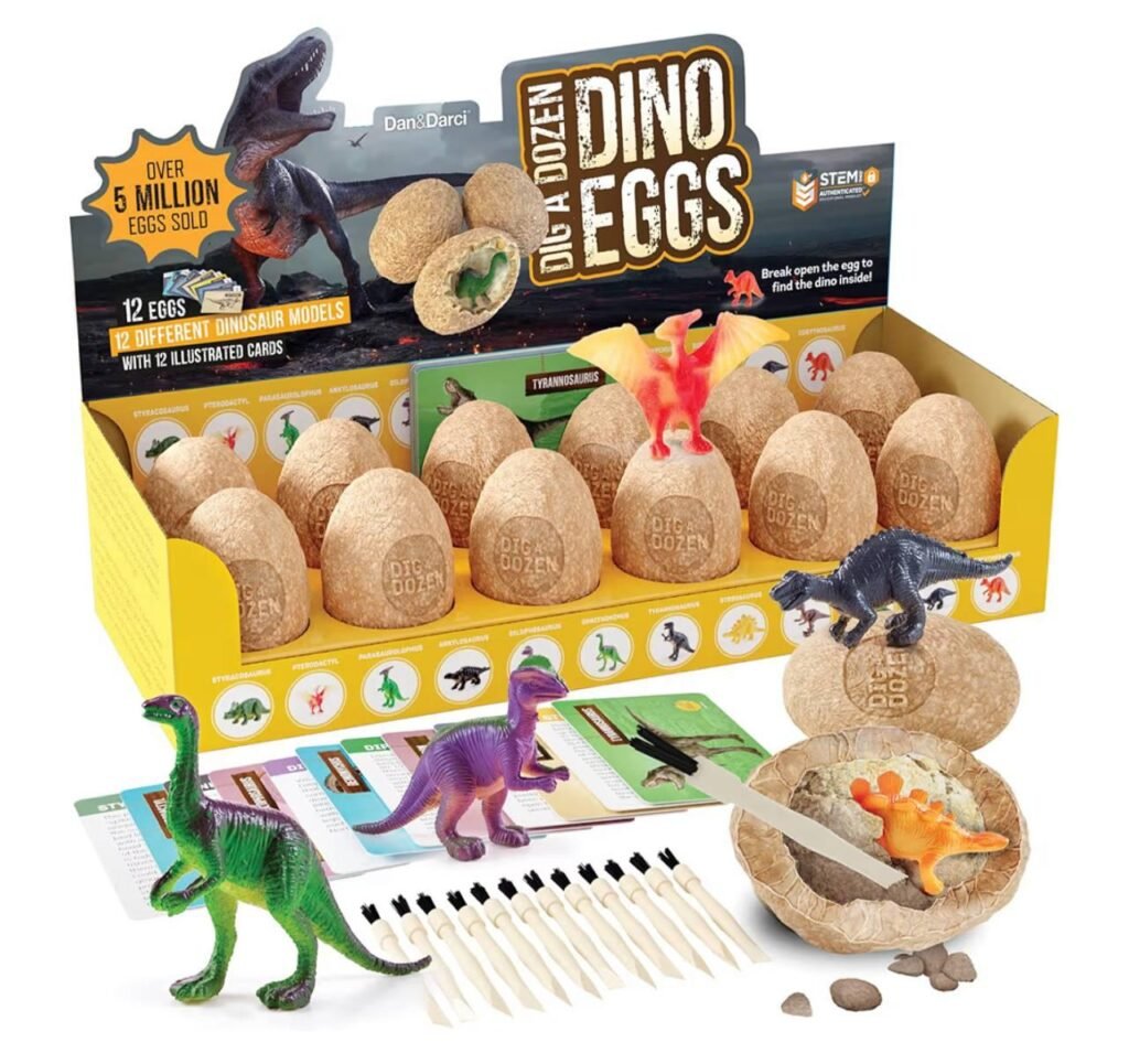 The Dan&Darci Dig a Dozen Dino Egg Kit is available for $19.99 at Amazon. This fun STEM toy includes 12 dinosaur eggs with surprise dinosaurs inside, perfect for kids ages 3-12. Ideal as a science activity, party favor, or basket stuffer, this kit encourages hands-on learning and creativity while keeping little paleontologists entertained.