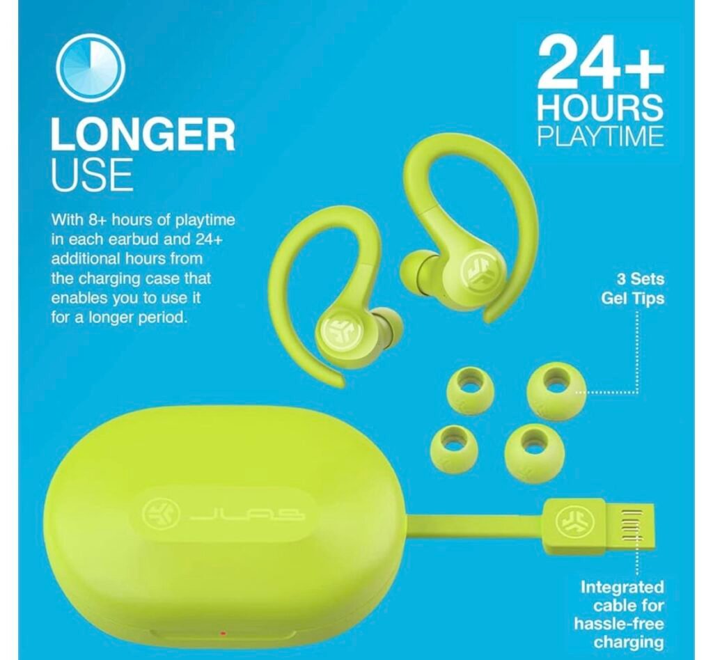 $19.99 JLab Go Air Sport True Wireless Earbuds, Yellow, Featuring C3 Clear Calling, Secure Earhook Sport Design, 32+ Hour Bluetooth Playtime, and 3 EQ Sound Settings