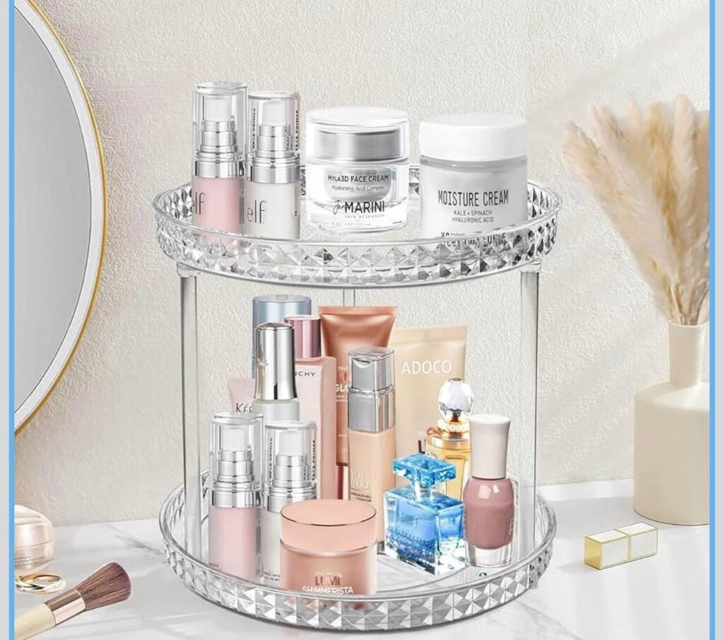 Keep your space neat and stylish with this 2 Tier Diamond Lazy Susan Bathroom Organizer, now just $9.xx at Amazon. This clear 360 rotating organizer is perfect for storing cosmetics, skincare, and everyday essentials while adding a modern touch to your countertop at a great price.
