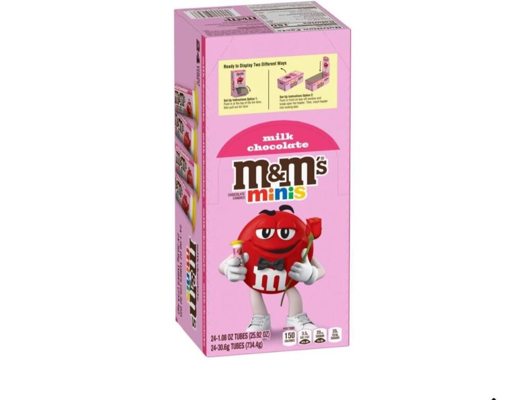 - Bulk pack of 24 tubes of M&M’S Valentine’s MINIS milk chocolate candy