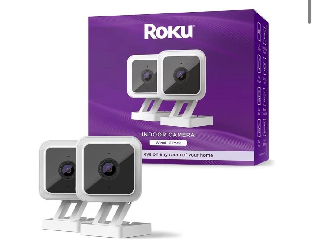 Keep your home safe and monitored with the Roku Indoor Camera 2-Pack. These wired security cameras offer 1080p HD video with color night vision and include motion and sound detection, a built-in siren, and a 90-day subscription. Compatible with Alexa and Google, they provide an easy way to enhance home security at an affordable price.