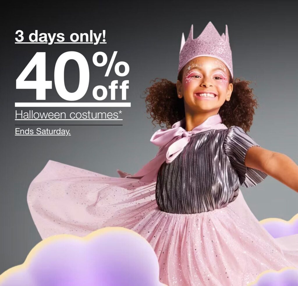 Get spooky-season ready and save big! For 3 days only, enjoy 40% off Halloween costumes at Target perfect for kids, adults, pets, and family matching sets. Whether you’re planning a trick-or-treat night, party, or school event, now’s the time to grab your favorite costumes before they’re gone.