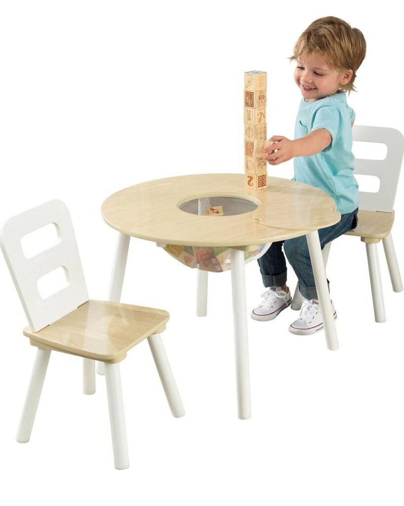 Create a fun and organized space for your little ones with the KidKraft Wooden Round Table and 2 Chair Set. This charming set is perfect for arts and crafts, snacks, and playtime activities. The table features a convenient center mesh storage compartment to keep toys, crayons, and art supplies neatly tucked away. Made with sturdy wood construction and a smooth finish, it’s both durable and safe for kids. The compact size fits perfectly in bedrooms, playrooms, or classrooms, providing a dedicated space for your children to learn, play, and create.