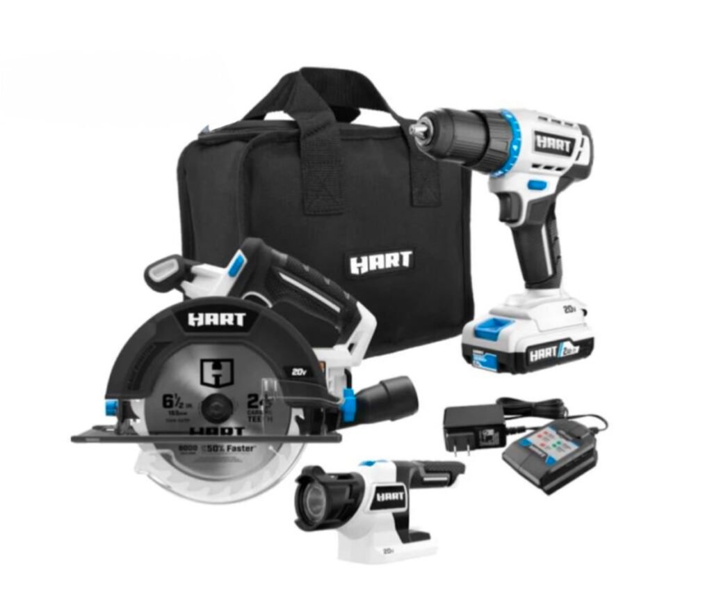 $59 Reg. $159 HART 20V 3-Tool Combo Kit, Drill, 6-1/2″ Circular Saw, and LED Light 1 Each