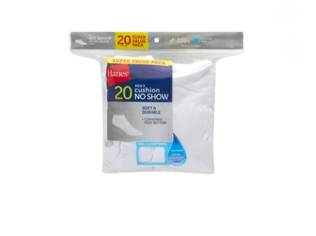 • $6 Hanes Men’s Moisture-Wicking No-Show Socks, 20-Pairs, Sizes 6-12, White