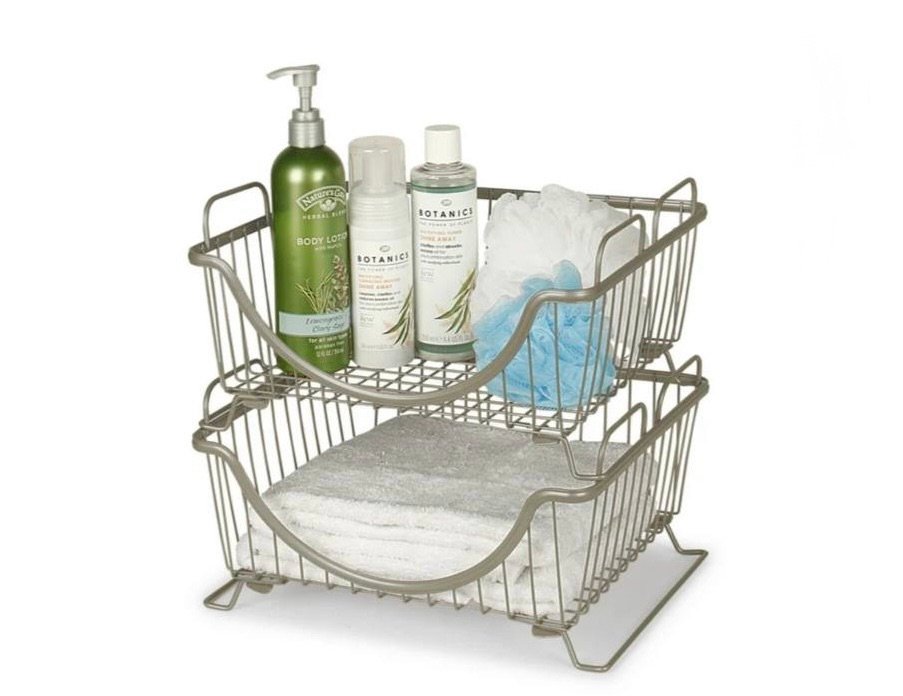with Raised Feet and Looped Handles, Modular Stacking Bin System for Kitchen Countertop and Desk Organization, Medium, Satin Nickel