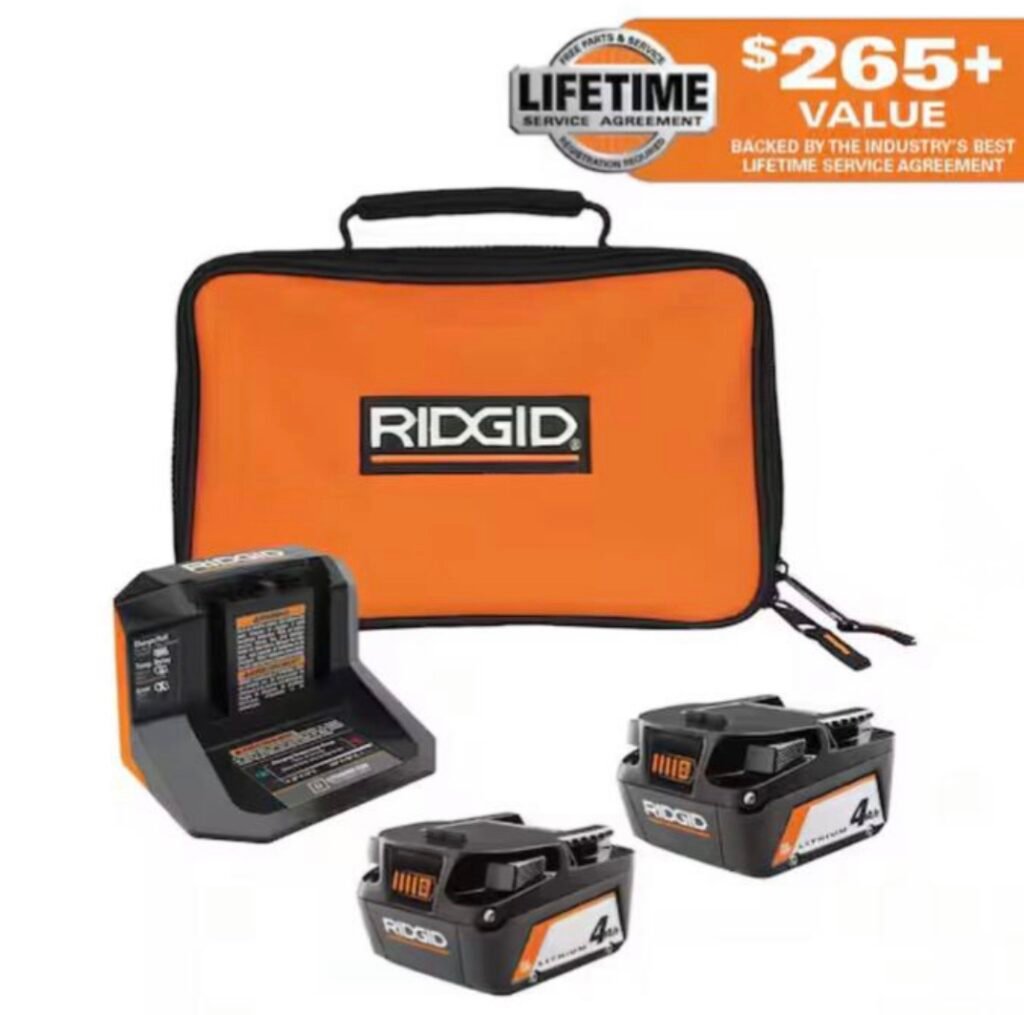 $69 Reg $277 RIDGID 18V Lithium-Ion (2) 4.0 Ah Battery Starter Kit with Charger and Bag