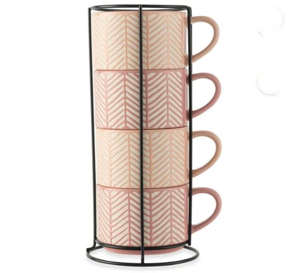 $9.98 Thyme & Table 4 Pack Stacking Mugs, Pink and White Lines 11.1 fl oz, Stoneware