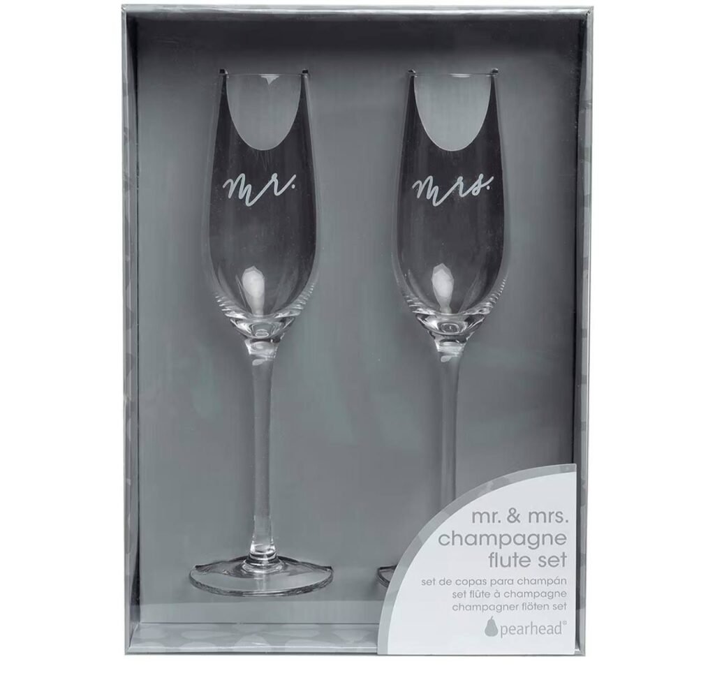 • Includes two tall champagne flutes labeled “Mr.” and “Mrs.” for wedding toasts or celebrations