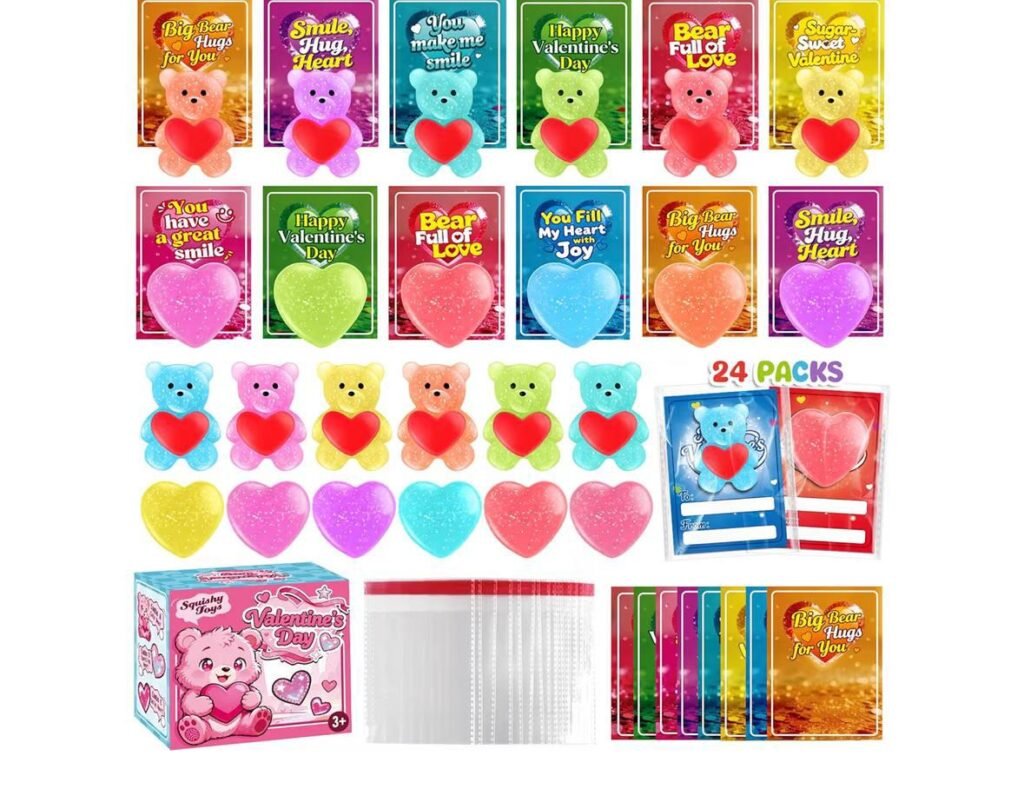 - Includes squishy fidget toys, Valentine’s cards, and bags