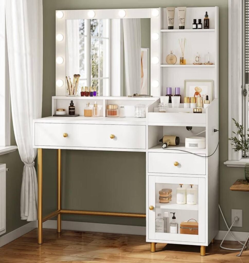 Upgrade your beauty routine with the AOGLLATI Makeup Vanity, now $91.xx at Amazon. This stylish white vanity desk features a lighted mirror with three color options, a built-in charging station, and a unique separation design, making it perfect for organizing makeup and accessories while adding elegance to any room.