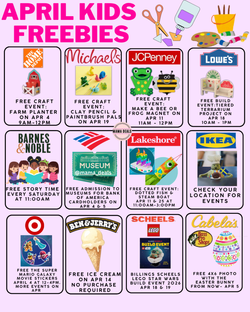 April is packed with free kids activities, crafts, and family events, making it one of the best months to save money while keeping your kids busy. Whether you’re looking for free DIY workshops, storytime events, or free food freebies, there’s something for every family.