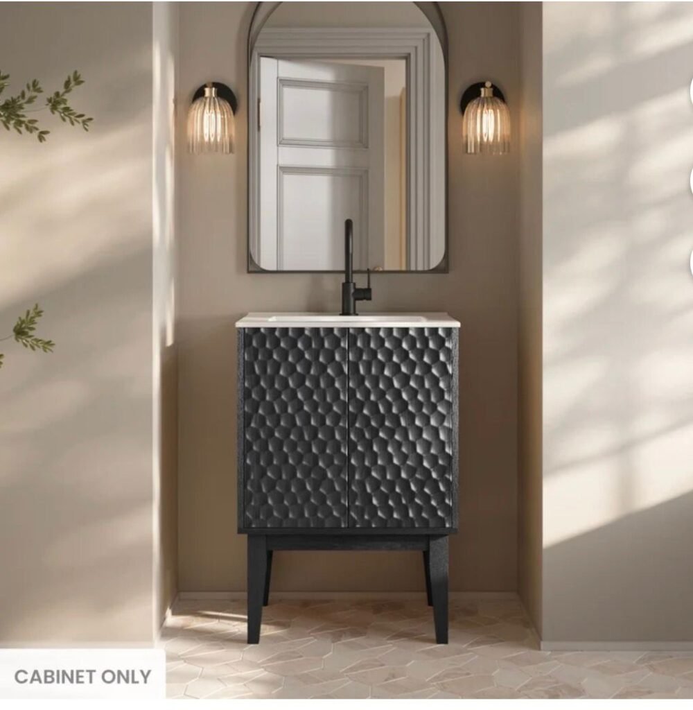 • Modern 24 inch freestanding vanity cabinet in a sleek black oak finish