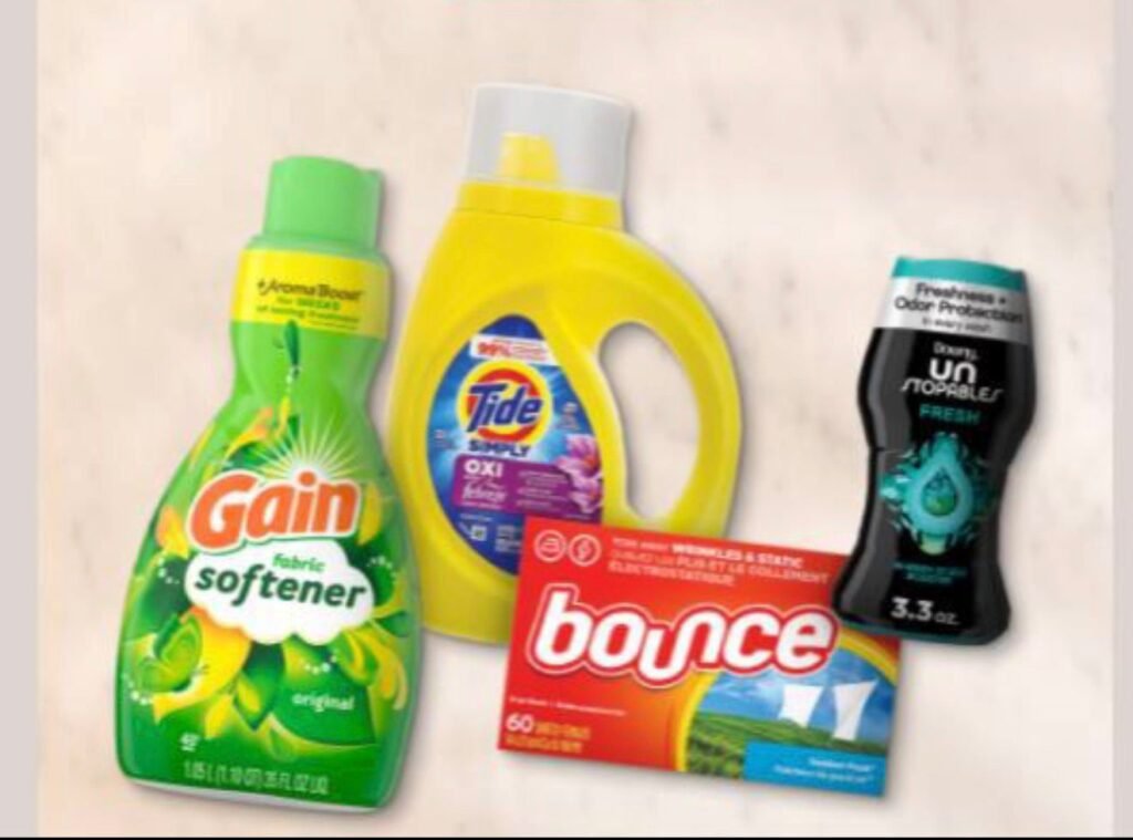 • Includes Bounce dryer sheets, Downy fabric softeners, Gain detergent, or Tide Simply laundry care products