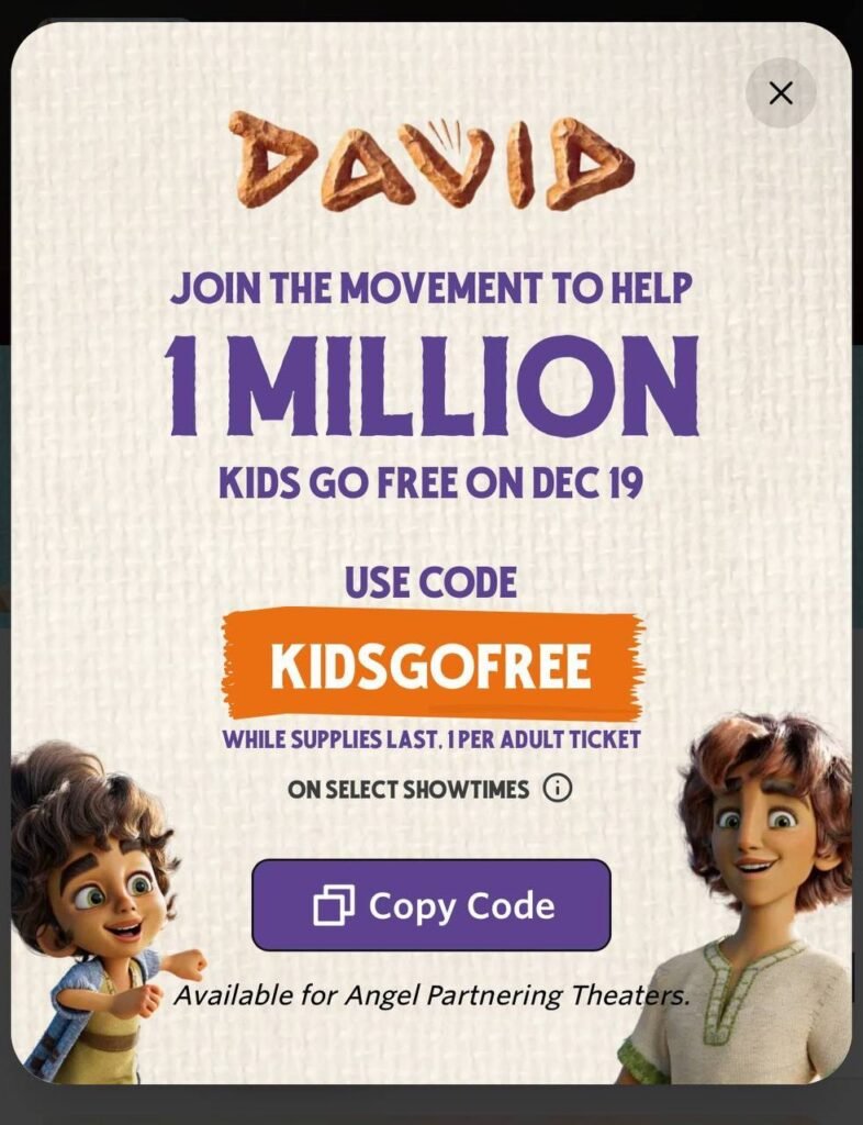 Looking for a family-friendly movie deal? For a limited time, when you buy 1 adult ticket, you can get 1 kid ticket FREE to see the new animated movie DAVID — exclusively at participating Angel Studios partnering theaters!