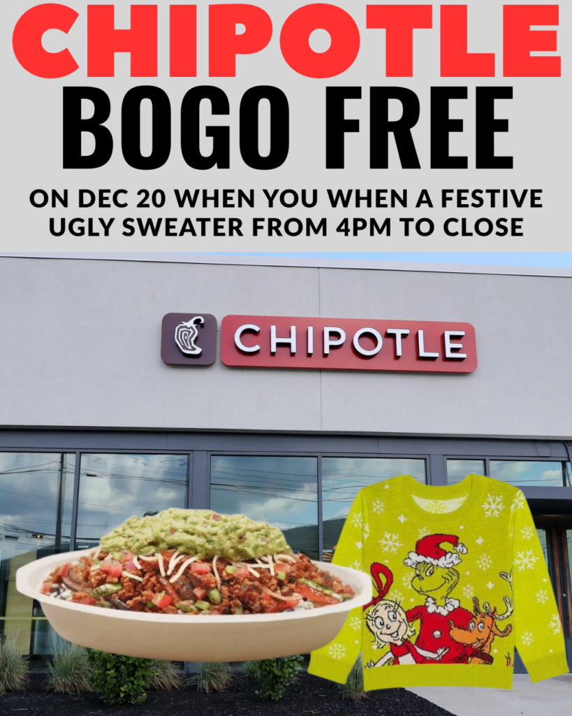 Chipotle is bringing back one of its most popular holiday promotions just in time for festive fun. December 20, from 4 PM to close, customers who wear a festive or over-the-top sweater can score a Buy One, Get One FREE entrée at participating Chipotle locations.