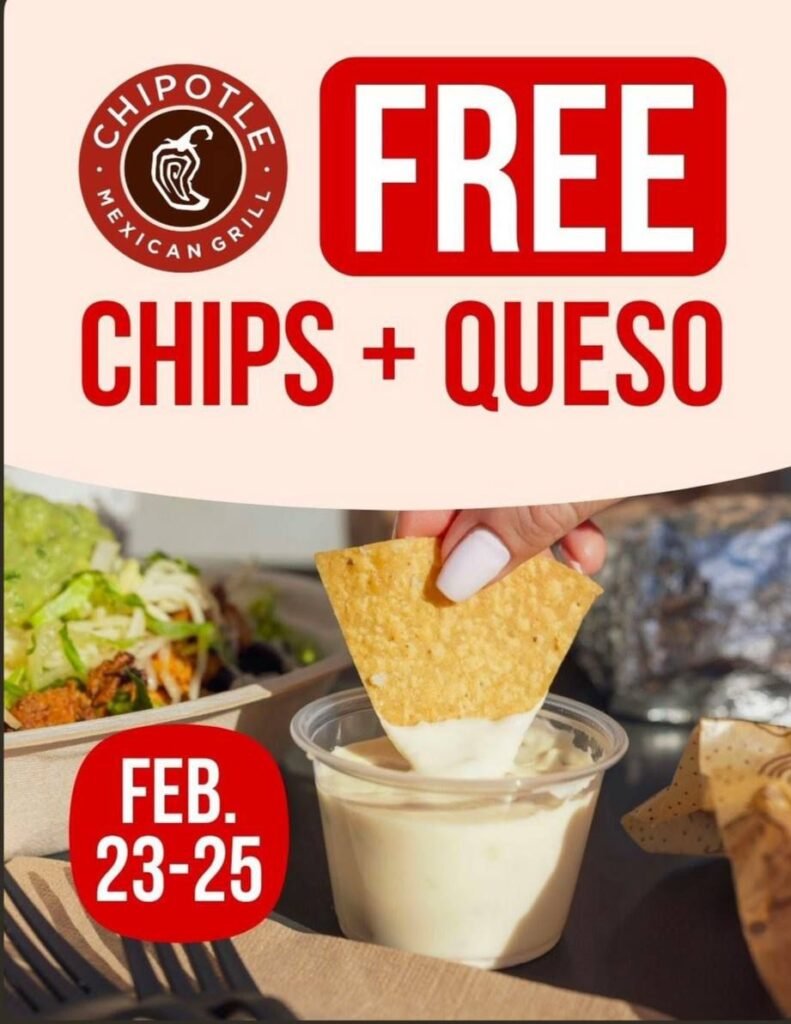 This limited time offer is the perfect excuse to grab your favorite burrito, bowl, or tacos and enjoy warm, crispy tortilla chips paired with their creamy, melty queso blanco. The deal is available for a short time only, so don’t wait too long to take advantage of it.