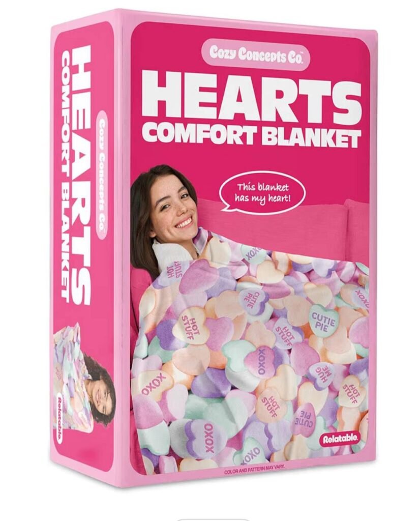 This Cozy Concepts Co. Hearts Comfort Blanket by Relatable is a super soft plush throw that makes a perfect Valentine’s Day gift for kids, teens, or friends. Featuring a heart-themed design, this blanket adds warmth and a touch of cozy style to any bedroom, dorm, or lounge space. Its plush fabric offers comfort for chilly evenings, movie nights, or everyday snuggles.