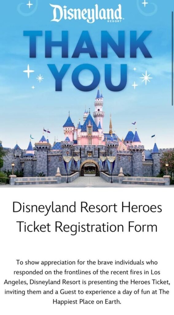 Eligible California firefighters, LA-based law enforcement personnel, emergency medical technicians and individuals from other departments that provided mutual aid assistance may register for 2 complimentary 1-Day Disneyland Park Hopper tickets for use for themselves and one Guest. The deadline to register is June 26, 2025.
