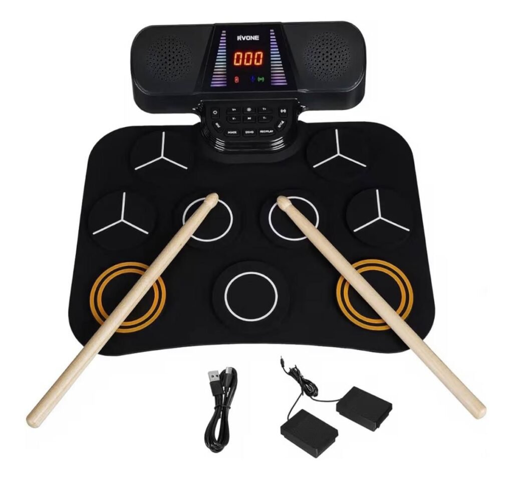 • Features 9 responsive drum pads that simulate different percussion sounds including snare, bass, and cymbals