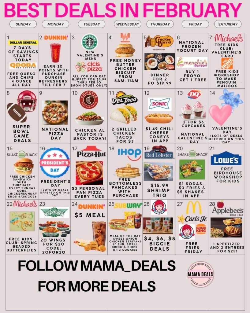 February is packed with food deals, freebies, kids activities, and limited-time promotions — and this February deals calendar is your guide to saving money every single week.