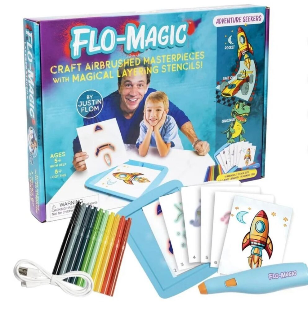 • Flo-Magic airbrush craft set for kids with magical layering stencils