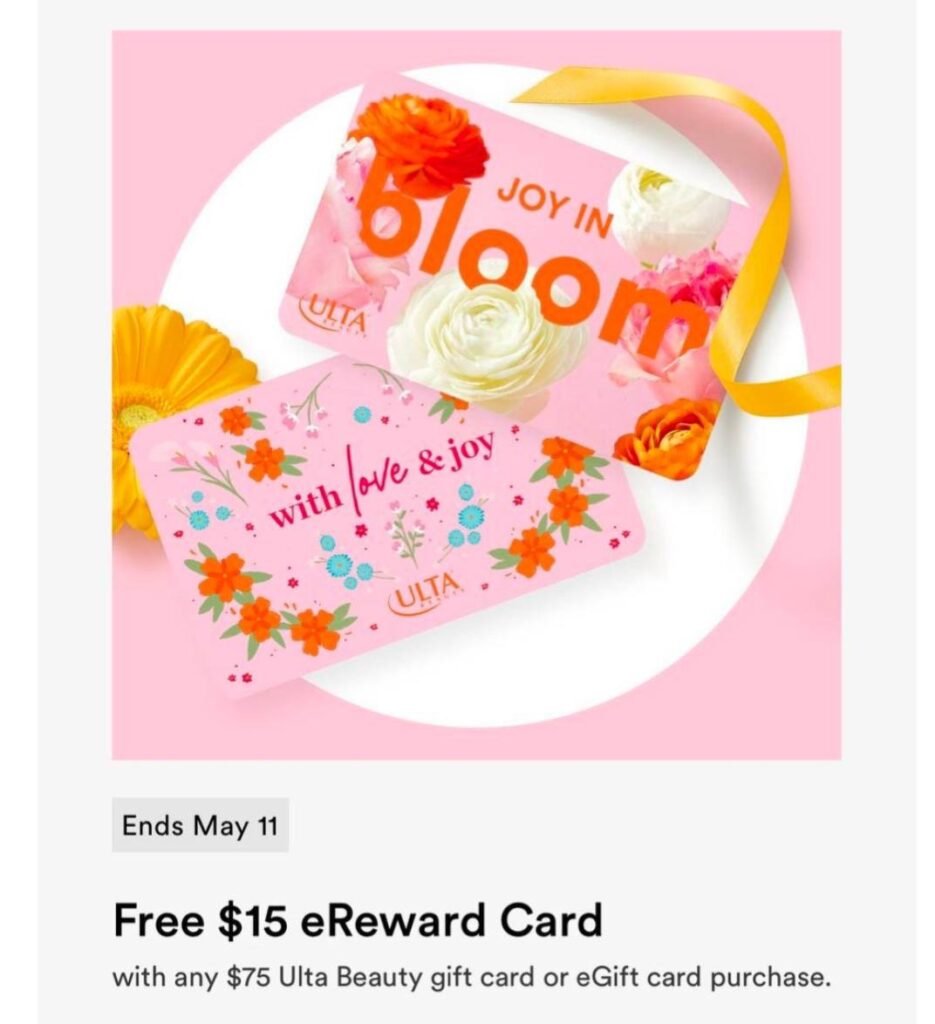Free $15 eReward Card When you buy $75 of Ulta Beauty gift cards or eGift Cards online