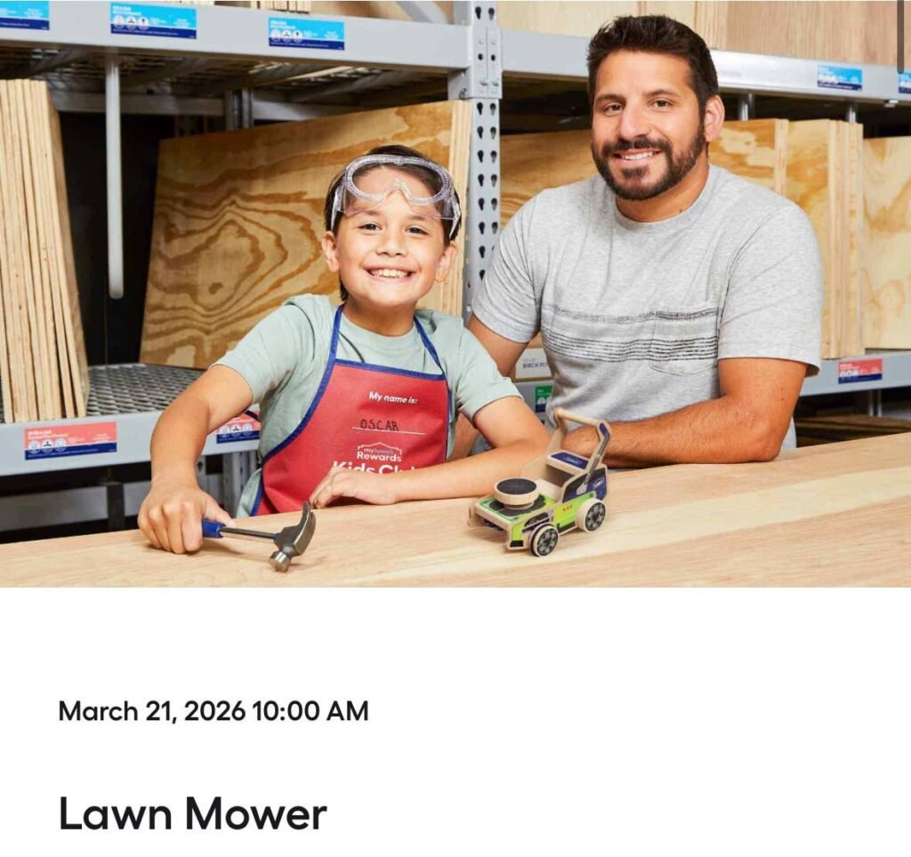 - Event: Free Lowe’s Workshop for Kids – Build a Push Lawn Mower Toy