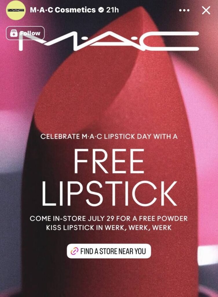 Calling all beauty lovers and lipstick fans! This National Lipstick Day, celebrate in style with MAC Cosmetics and score a free full-size Powder Kiss Lipstick in the fan-favorite shade Werk, Werk, Werk-absolutely free and with no purchase necessary! This exclusive one-day-only offer is available in-store only on Monday, July 29, so be sure to visit your nearest MAC Cosmetics store early before supplies run out. This is the perfect chance to refresh your makeup collection, discover a new favorite shade, or treat a friend.
