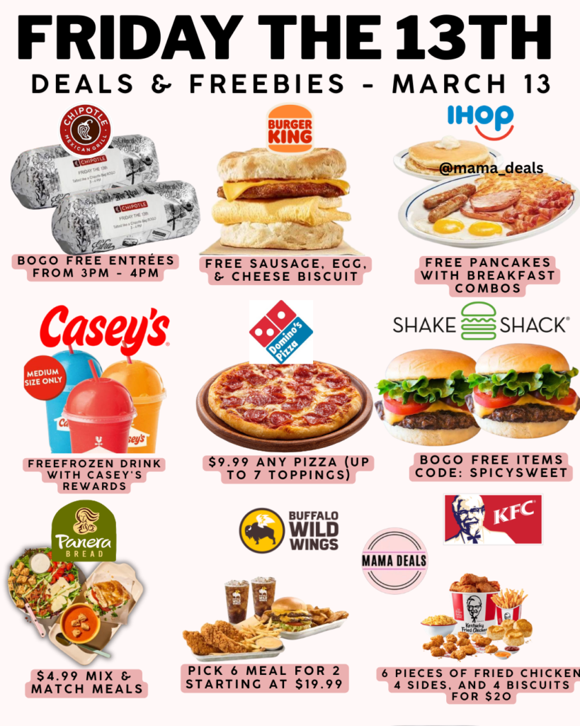 Looking for the best Friday the 13th food deals and freebies? Many popular restaurants are offering BOGO meals, free food, and discounted combos on March 13, 2026. From Chipotle and Burger King to Domino’s and Buffalo Wild Wings, these limited-time deals can help you grab breakfast, lunch, or dinner for less.