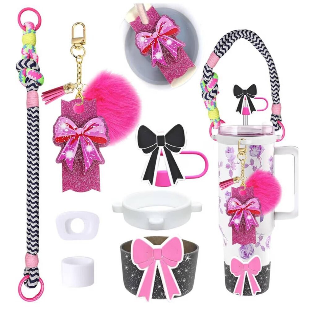 - Includes 8 accessories such as straw topper, keychain charms, handle strap, silicone boot, and bow lid topper