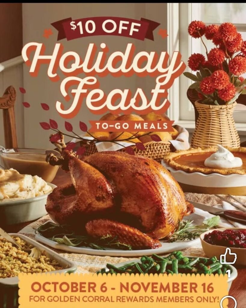 Golden Corral is offering $10 off their Holiday Feast To-Go Meals for a limited time! This deal is available now through November 16 for Golden Corral Rewards Members. Perfect for Thanksgiving, Friendsgiving, or any holiday gathering where you want a full meal without the stress of cooking.