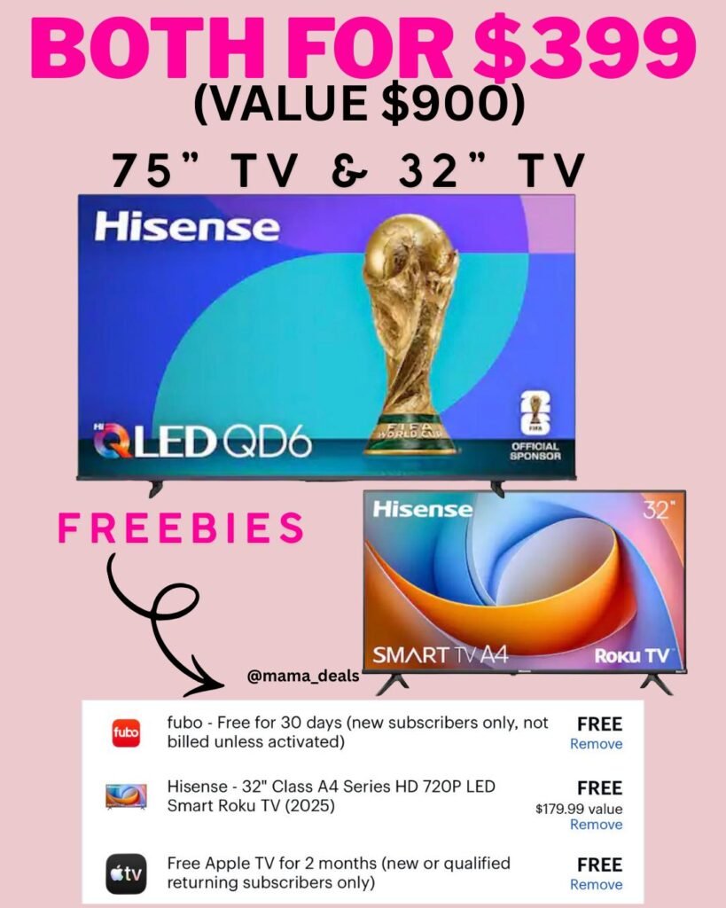 This limited-time bundle deal includes the Hisense 75-inch QD6 Series Hi-QLED 4K UHD HDR Smart Fire TV paired with a free Hisense 32-inch A4 Series HD Roku TV, both from the 2025 lineup. It’s a strong value for anyone upgrading a main living room TV while also adding a secondary smart TV for a bedroom, office, or guest space. The QD6 delivers vibrant color and sharp 4K clarity, while the bonus Roku TV adds simple streaming flexibility at no extra cost.
