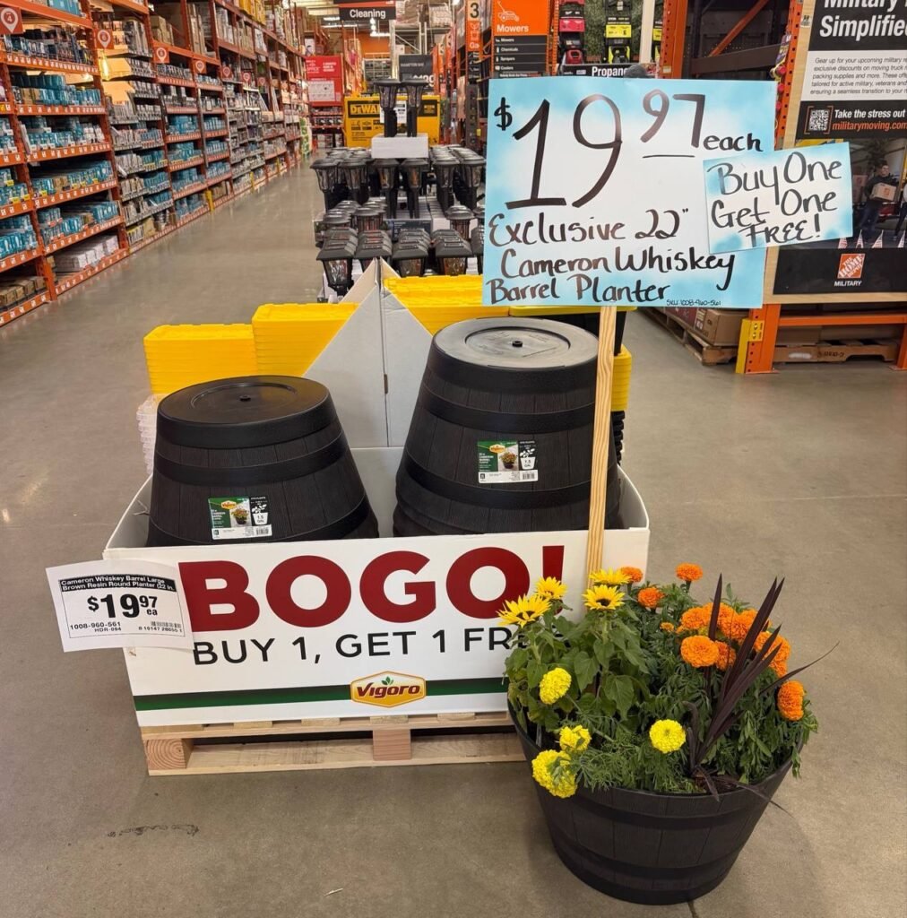 Look at what I found at my local Home Depot store. This is perfect to refresh your outdoor space for spring. My store has this 22” Cameron Whiskey Barrel Planters for Buy One, Get One FREE. These large decorative planters are priced at $19.97 each, making this an incredible value when you buy two.