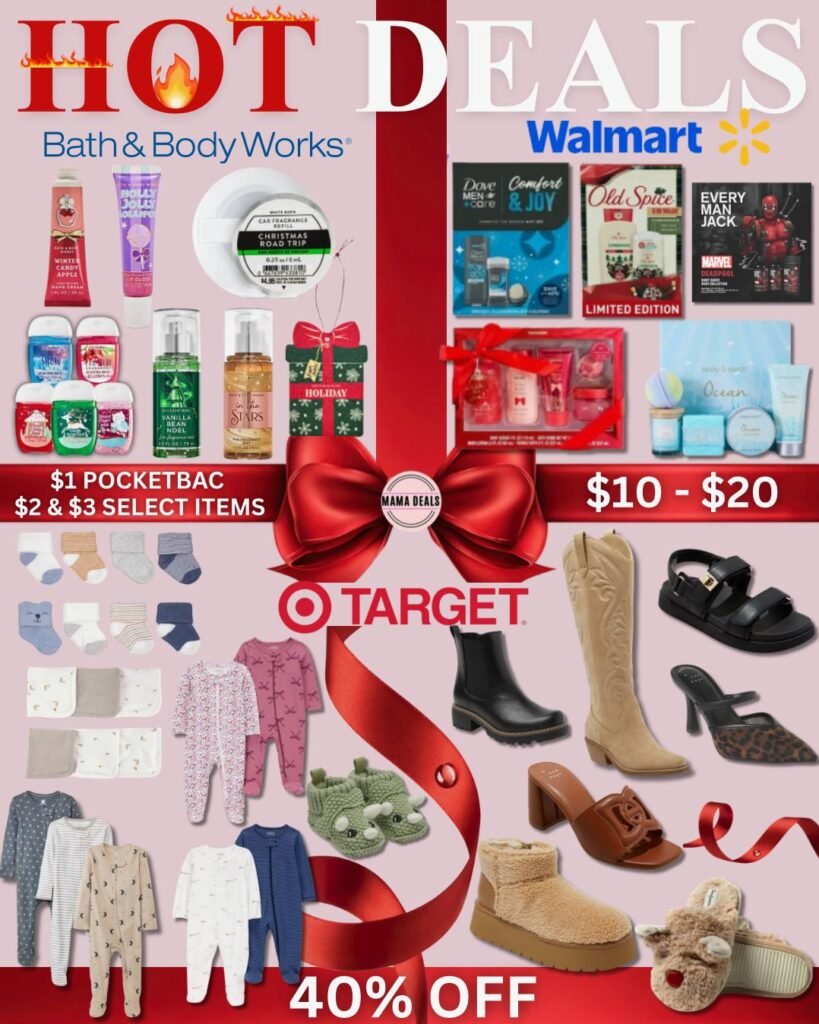 Hot deals are happening today only across multiple retailers, making it a great time to score quick savings before prices go back up. Target is offering 40% off baby clothes and 40% off women’s shoes for one day only, perfect for refreshing wardrobes or grabbing essentials at a discount. Walmart has select gift sets priced between $10 and $20, ideal for affordable gifting, while Bath & Body Works is featuring $1, $2, and $3 stocking stuffers for budget-friendly last-minute finds. Deals are available for a limited time and while supplies last, so shoppers may want to act fast.