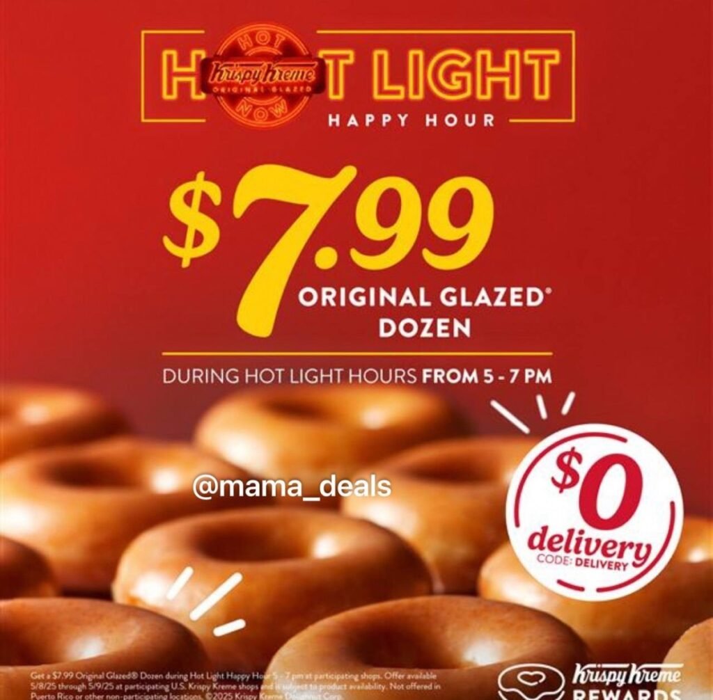 Hot Light Happy Hour at Krispy Kreme local time from 5-7pm! $7.99 Original Glazed Dozen with $0 delivery fee with code DELIVERY