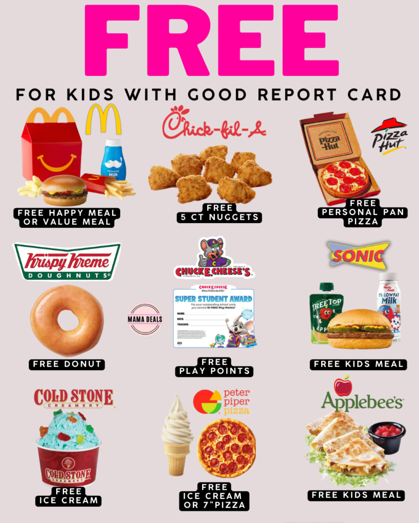 Looking for an easy (and fun!) way to reward your kids for good grades? Many popular restaurants across the U.S. offer free food rewards for students with good report cards—including free meals, pizza, ice cream, and more.
