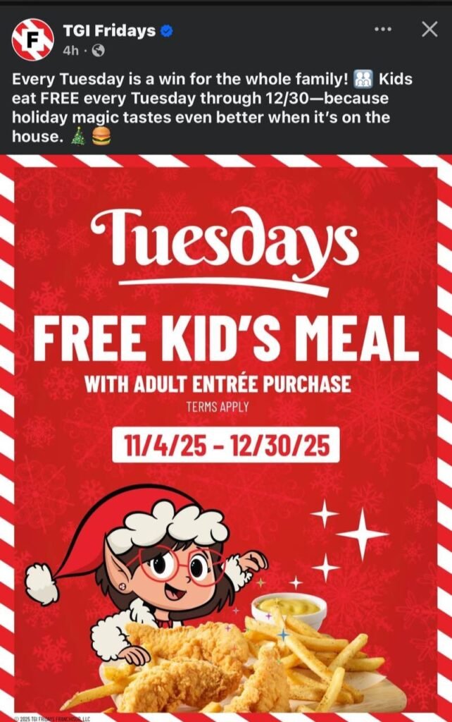 Make Tuesdays extra delicious for the whole family! TGI Fridays is offering a FREE Kid’s Meal with the purchase of any adult entrée — every Tuesday from November 4, 2025 through December 30, 2025. It’s the perfect mid-week dinner deal to enjoy during the holiday season and beyond!
