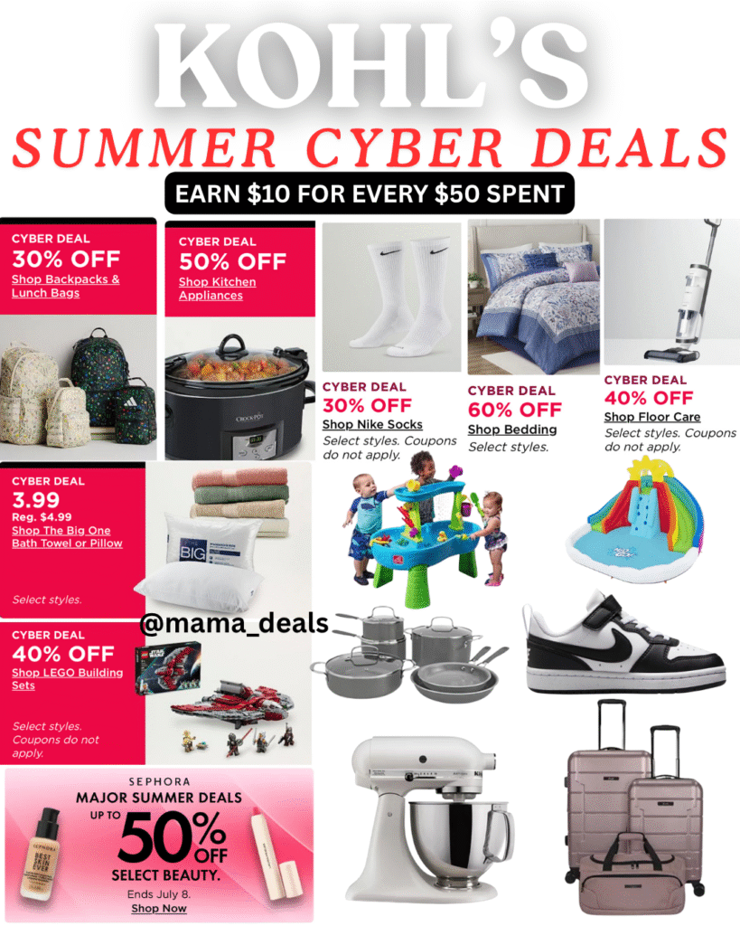 Kohl’s Summer Cyber Deals is live. Score $10 for every $50 spent. Shipping is free!!!