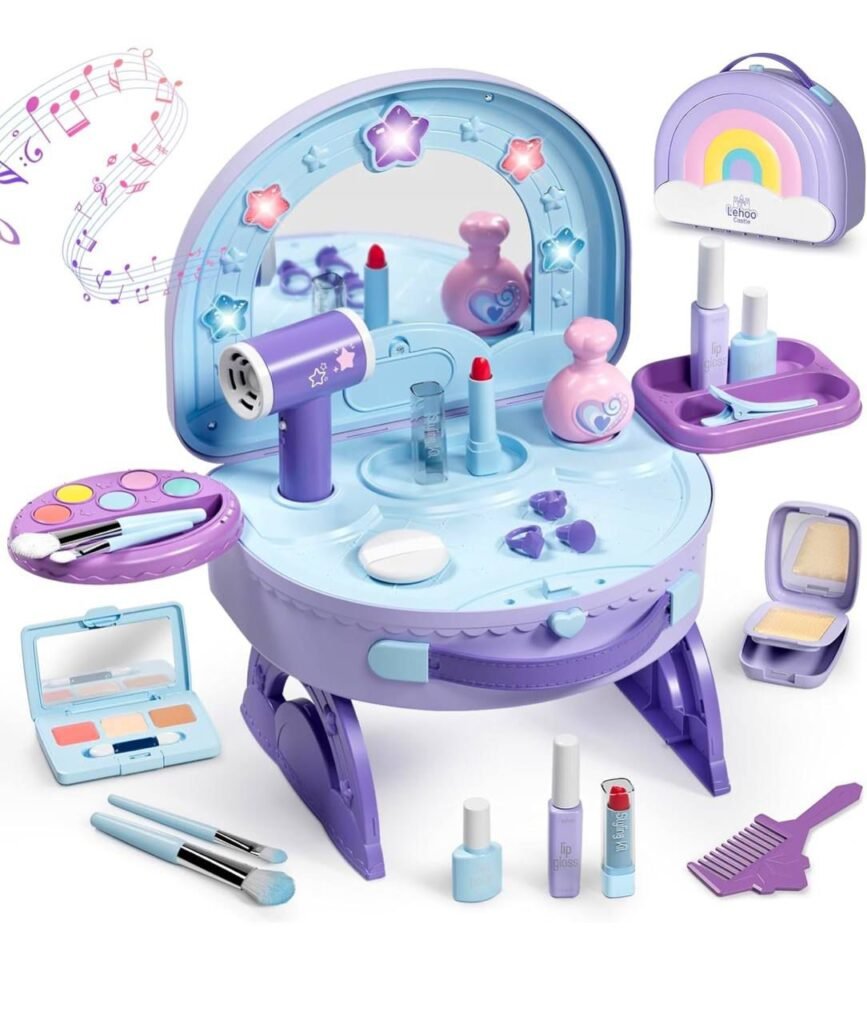 This adorable Lehoo Castle Toddler Vanity offers a fun and portable play experience with lights, music, and a working electric toy hairdryer. It’s designed for imaginative play and easy travel, making it a great gift option for little ones who love pretend makeup and beauty accessories.