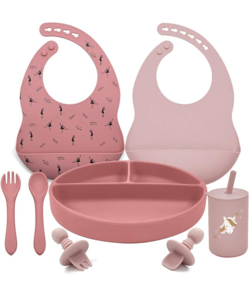 Made from soft, safe, and durable silicone, the set is gentle on your baby’s gums and easy to clean. The suction plate helps prevent spills, while the included bib keeps clothes clean during mealtime. This pink?red feeding set is perfect for encouraging independence and developing self?feeding skills in your baby, making every meal a stress?free experience.
