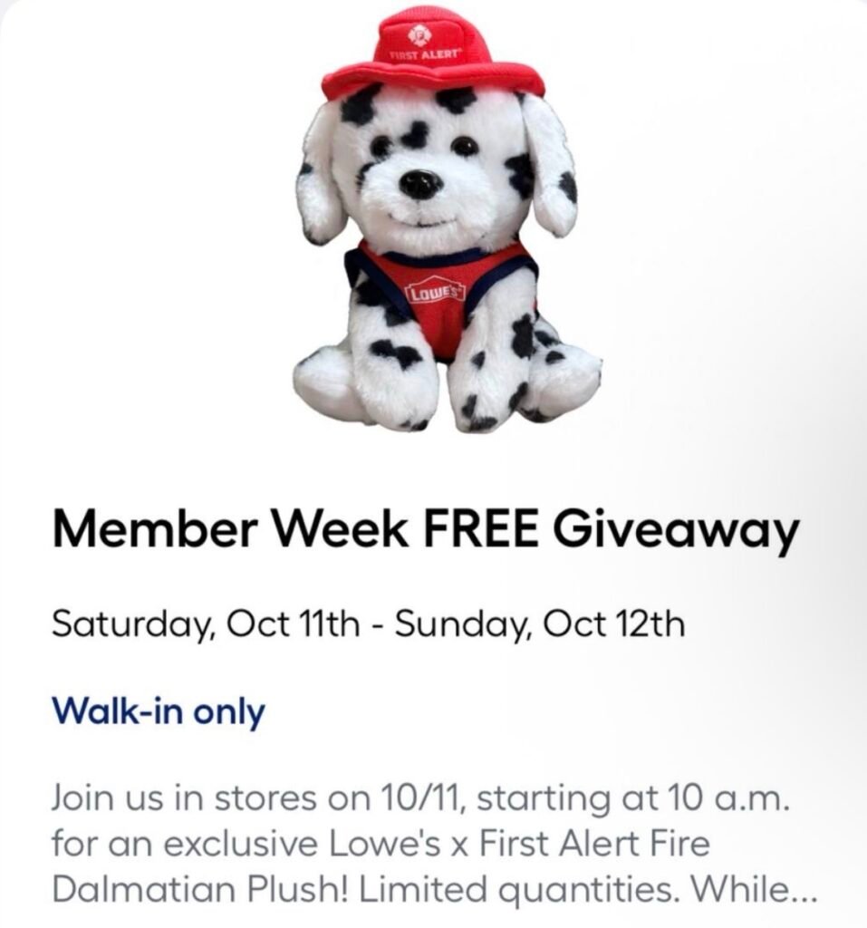 Visit a participating Lowe’s store at or after 10:00 a.m. on Oct 11. Ask an associate about the Member Week giveaway for the First Alert Fire Dalmatian Plush. No shipping—this is an in-store, walk-in promo only. When they’re gone, they’re gone.
