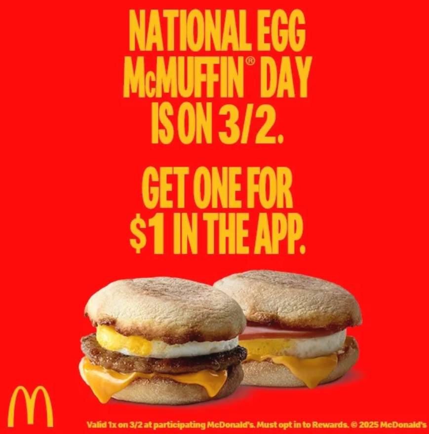 Mark your calendars because McDonald’s is serving up a one day breakfast deal you won’t want to miss. On March 2, you can grab an Egg McMuffin or Sausage McMuffin for just $1 when you order through the McDonald’s app during breakfast hours. This limited time offer is perfect for anyone looking to start their morning with a hot, satisfying sandwich at an unbeatable price.