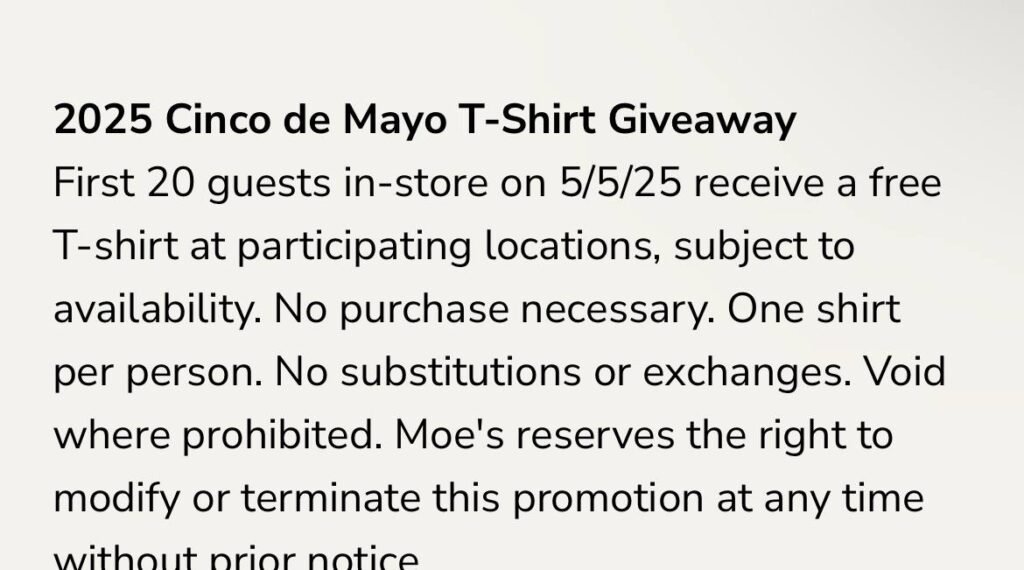 • Moe’s Cinco De Mayo T-Shirt Giveaway First 20 Guests In Store Only on 5/5