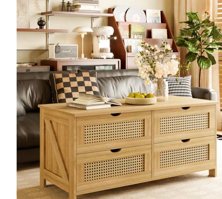 $45 Rattan Wooden Coffee Table, 4 Drawers Cocktail Table With Storag